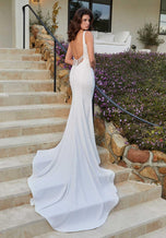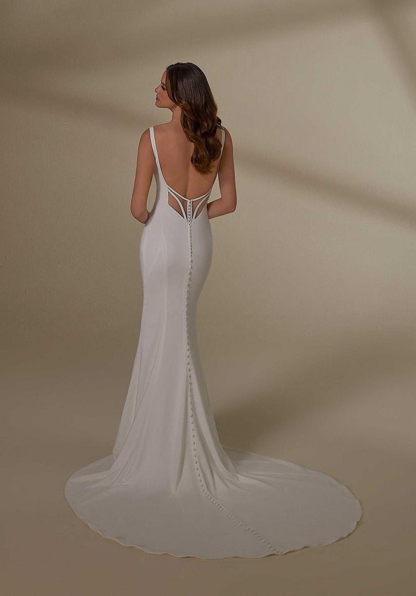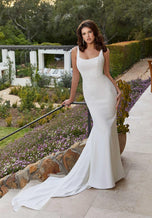 The name of this Morilee Blu Gown is MaddieOur Maddie designer wedding dress is structured and simplistic. The curve-hugging crepe fit and flare features a square neckline and contoured seams to define your figure. The best part is the open back with sheer detailing, for a cool, cutout look. Shown in Ivory/Honey.