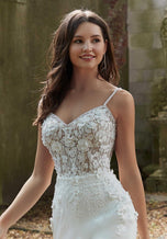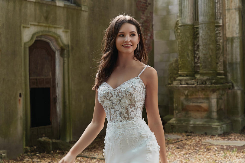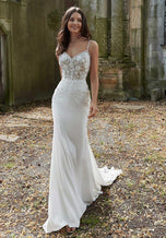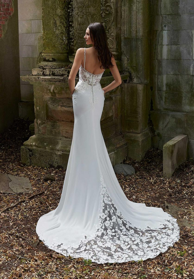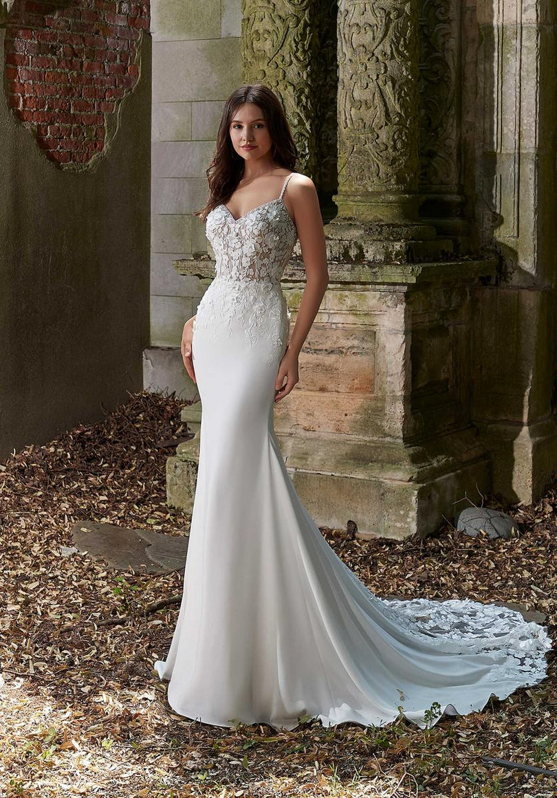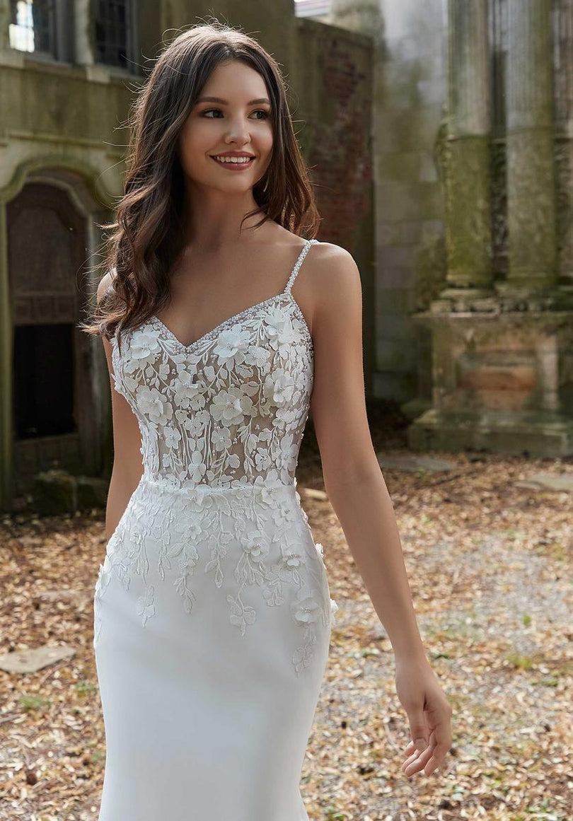Sexy crepe and romantic lace combine to create our Phoebe designer wedding dress. The stunning fit and flare features a sheer boned bodice designed with pearl beaded, three-dimensional floral appliques. The crepe skirt creates a striking contrast with its sleek look and we love the dreamy touch of the cut-away lace train. Shown in Ivory/Honey.