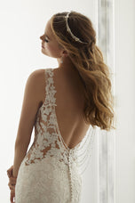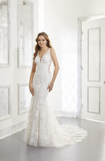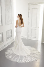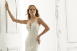 Accented with frosted embroidery, the fit and flare silhouette of the Alessia gown features a feminine V-neckline with center front Net inset. A gorgeous detachable chandelier back detail leads way to the cascading sheer, tulle train. Available in three lengths: 55, 58, 61. shwon in Ivory/Sand/Honey.