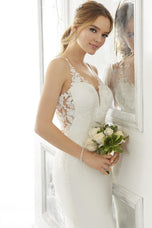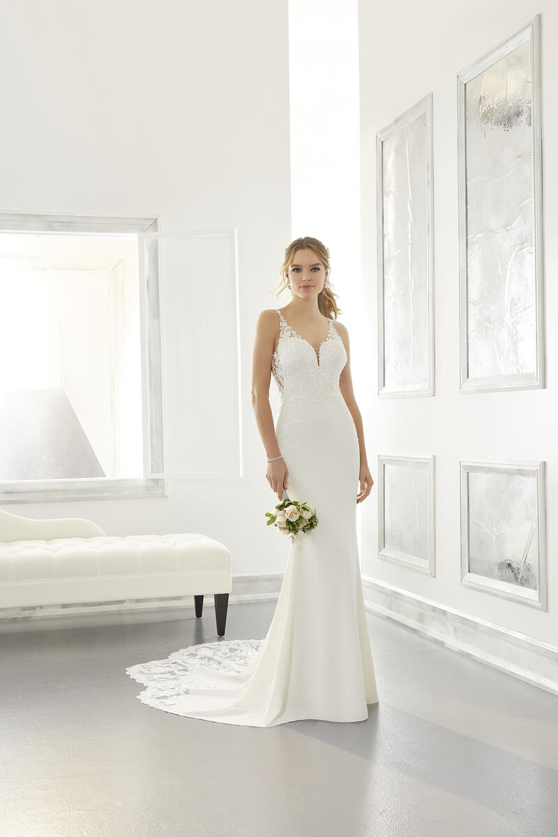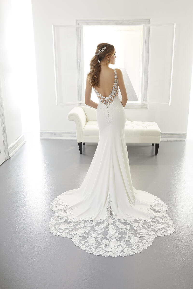 Fitted and flared in all the right places, this sleek yet chic destination bridal gown is Annika, style 5872 from Morilee's Fall 2020 Blu Bridal Gown collection. This slim, crepe silhouette is accented with delicate, beaded illusion straps and a low, open back that will sparkle and shine in the dim light of your outdoor wedding, beach ceremony or whimsical, wooded ceremony setting. A cutaway, illusion scalloped train complete the look--an especially fun trend this season! An affordable look that isn't shy on style, this demurely sexy style will be on their minds long after the honeymoon is over! Shown in Ivory/Honey. Please call our Dallas, Texas location to check in-store availability, pricing and current ship dates.