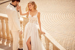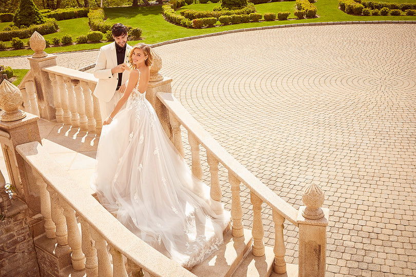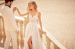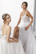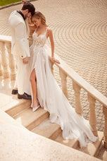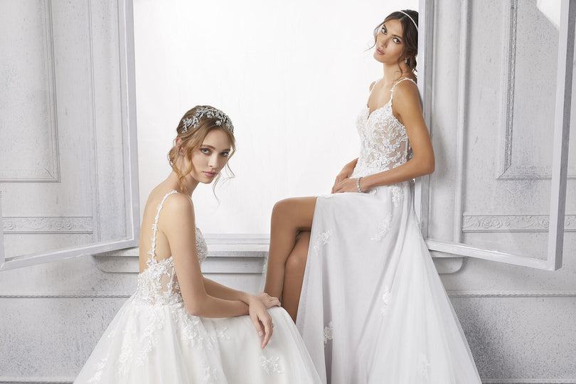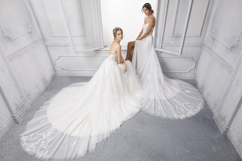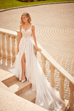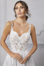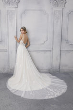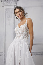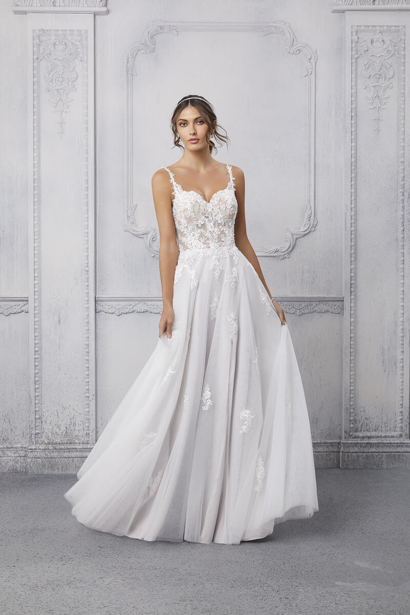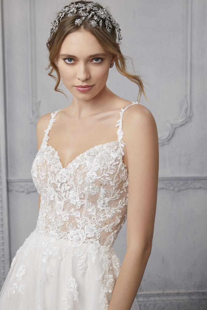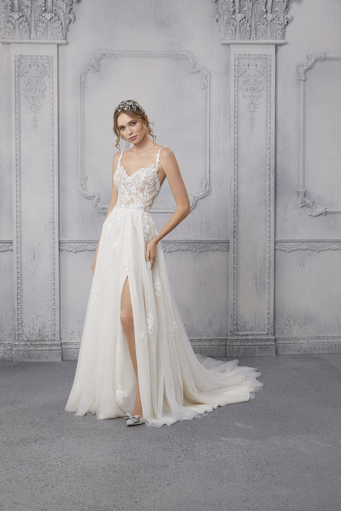 The name of this Morilee Blu Gown is is Cipriana.Pretty as a picture, our Cipriana designer wedding dress features elegant pearl and crystal beaded, frosted, embroidered appliques cascading down from a sheer, boned bodice. The effortless A-line has a soft tulle skirt that creates beautiful movement and a daring front slit for a pop of leg. Completed by breathtaking details, like the open back and sheer train, with lace edging, this gown is a certified bridal beauty. Shown in Ivory/Champagne/Honey and Ivory/Smokey/Lavender/Honey. Styled with Headpiece Style HP4081. Available with front bodice lining as Style 5915LB.