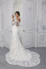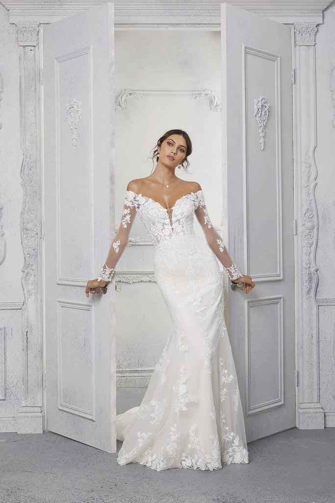 The name of this Morilee Blu Gown is is Cindy.Classic meets contemporary in our Cindy designer wedding dress. We cant stop staring at the romantic frosted, embroidered appliques that decorate the tulle over glitter tulle gown. From the sophisticated off-the-shoulder neckline to the immaculate illusion back, and sultry fit and flare shape, Cindy is a gown that has it all. Shown in Ivory/Champagne. Available in three lengths: 55", 58", 61".