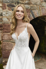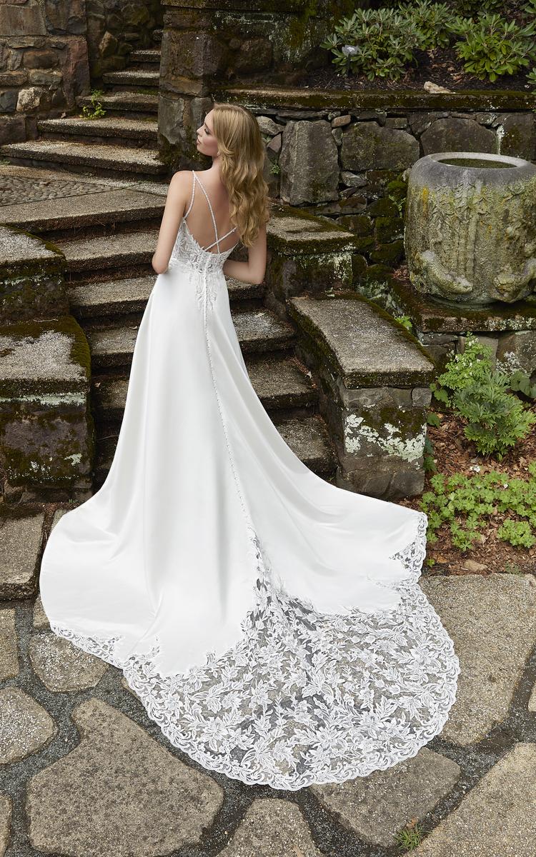 The name of this Morilee Blu Gown is is Darcy.Modern style meets understated glamour in our Darcy wedding dress. The sheer, boned bodice features hand-embroidered floral lace and crystal beaded straps with crisscrossing detail in the back for that touch of bridal sparkle. The chic, satin A-line skirt has added pockets and offers you clean and contemporary lines, while the scalloped, cut-away lace train is a romantic nod to our signature style. Shown in Ivory/Ivory. Available in three lengths: 55?, 58?, 61?.