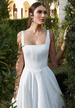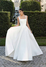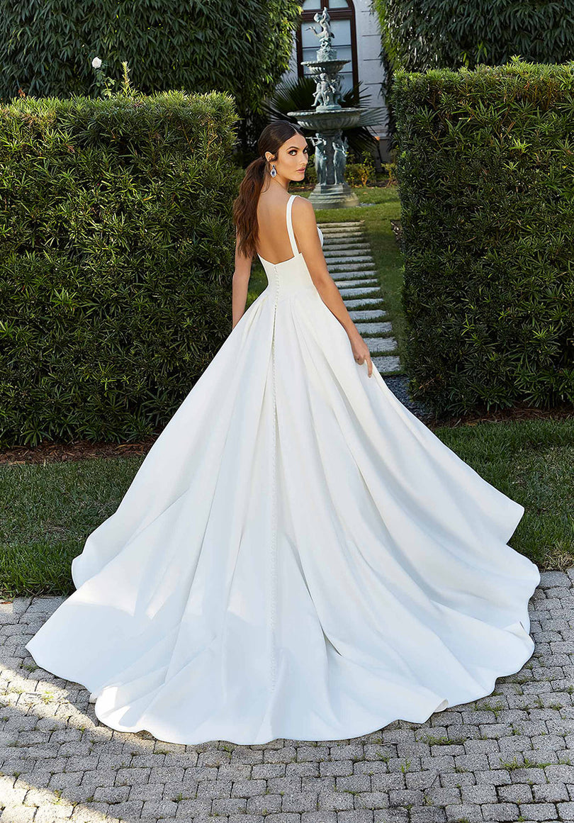 The name of this Morilee Blu Gown is FlaviaA classic silhouette with contemporary touches, our Flavia designer wedding dress is the definition of modern minimalist princess. The box-pleated ball gown features a structured corset bodice creating a chic square neckline and soft basque waist. And in lustrous petal satin , you'll have that perfect bridal glow. Shown in Ivory. Available in three lengths: 55", 58", 61".