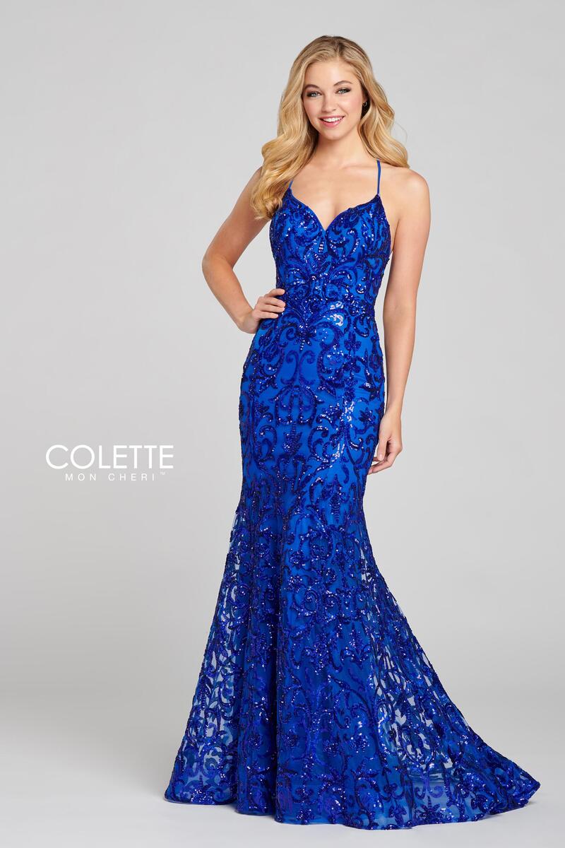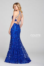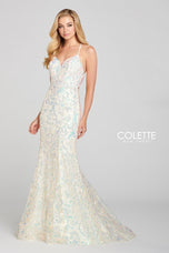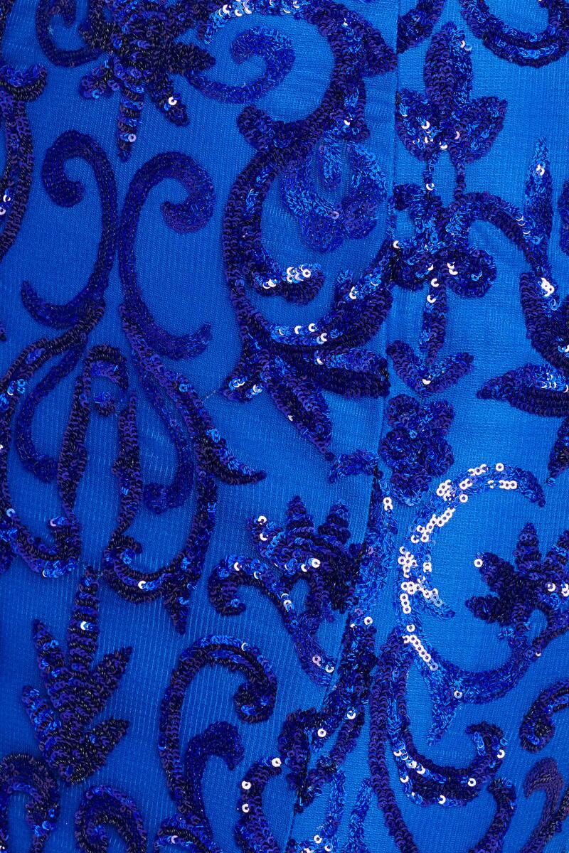 Sleeveless sequin tulle sheath gown, with a V-neck, natural waist, horsehair hem, and sweep train.