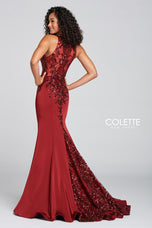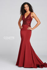 Sleeveless stretch crepe and sequin tulle sheath gown, with a V-neck, natural waist, horshair hem, and sweep train.