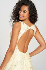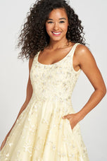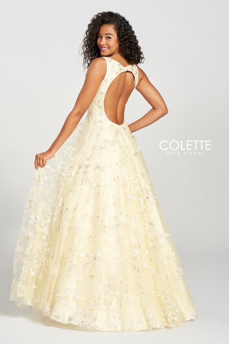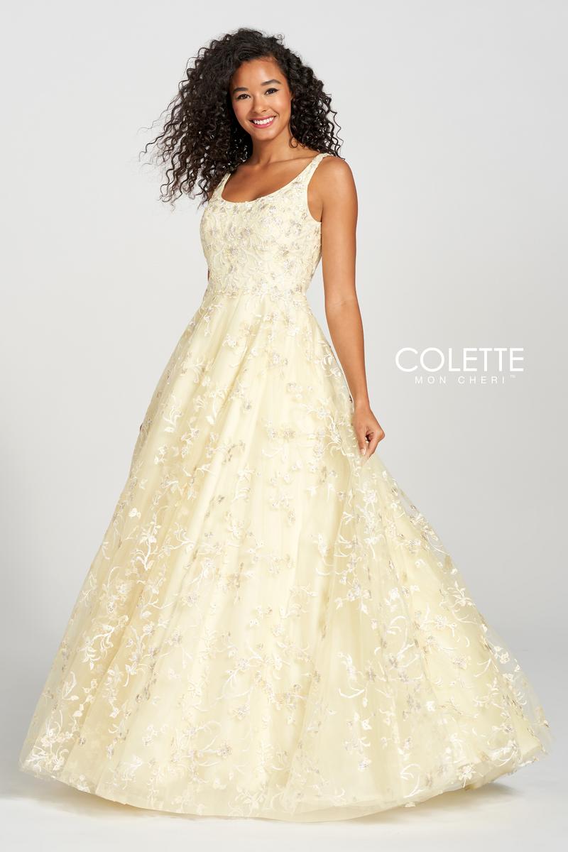 The fabric in this Colette by Daphne style is Tulle ball gown, beaded embroidered lace, scoop neckline, and keyhole back. Features Pockets