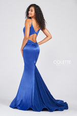 The fabric in this Colette by Daphne style is Stretch satin, deep V neckline, mermaid skirt