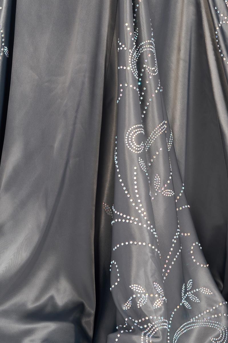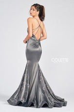 The fabric in this Colette by Daphne style is Stretch satin, deep V neckline, mermaid skirt, rhinestones on gussets