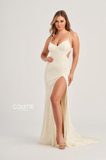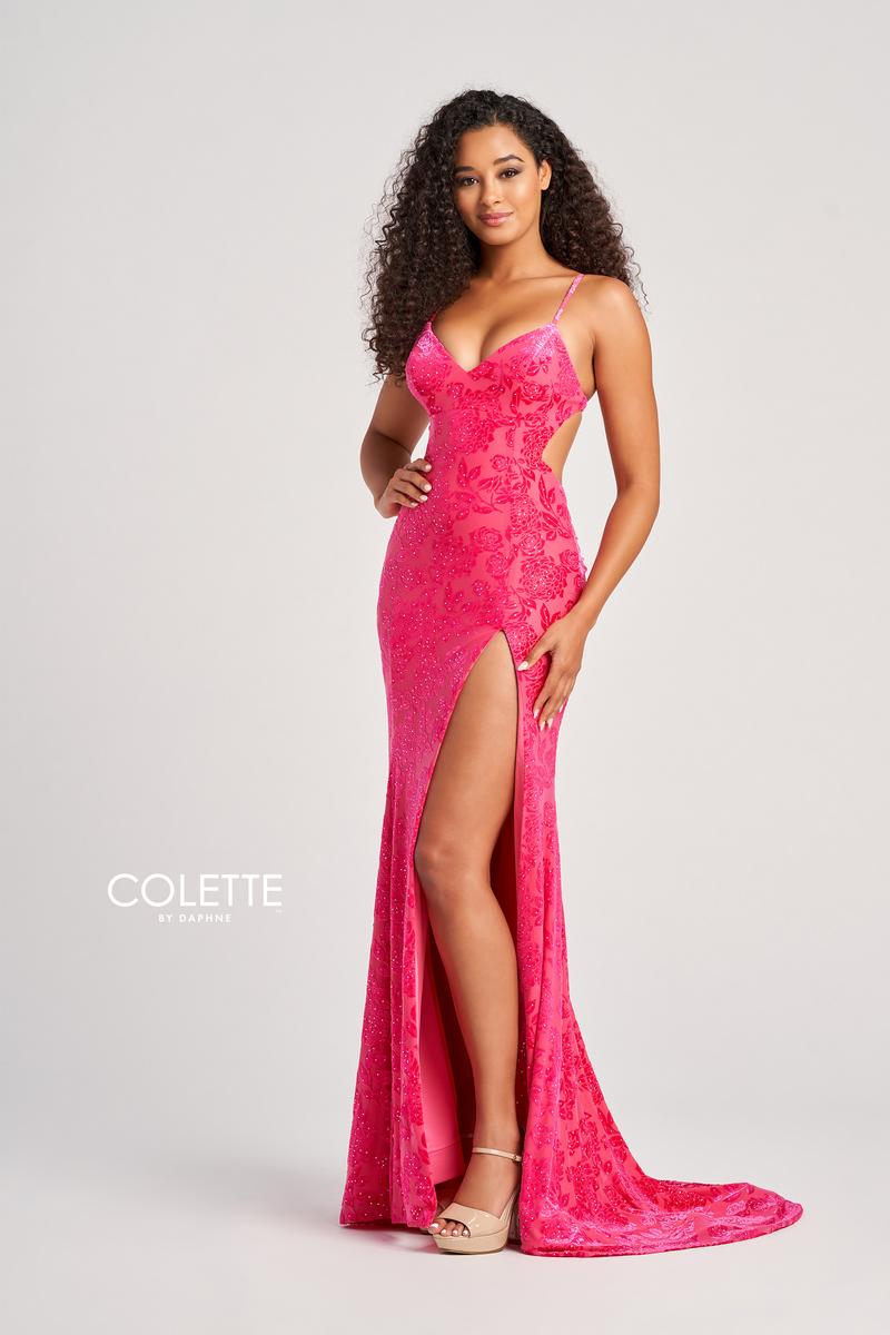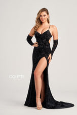 Spaghetti Straps, High Slit, Allover Stone Accents, Burnout Velvet Fabric, Matching Fingerless Gloves