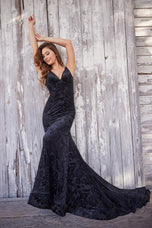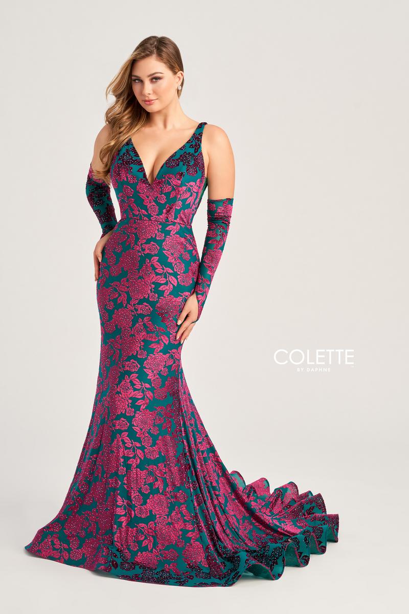 Burnout Stretch Velvet, Allover Stone Accents, Plunging Back, Mesh Side Insets, Horse Hair Hem, Matching Fingerless Gloves