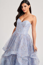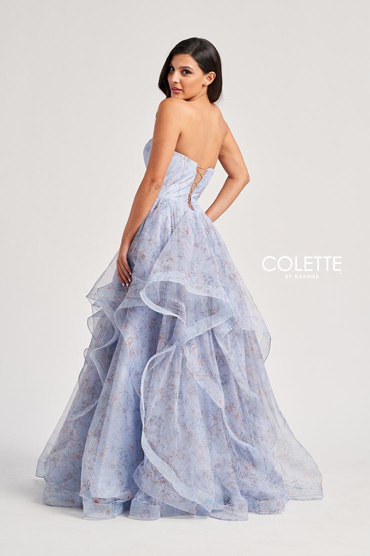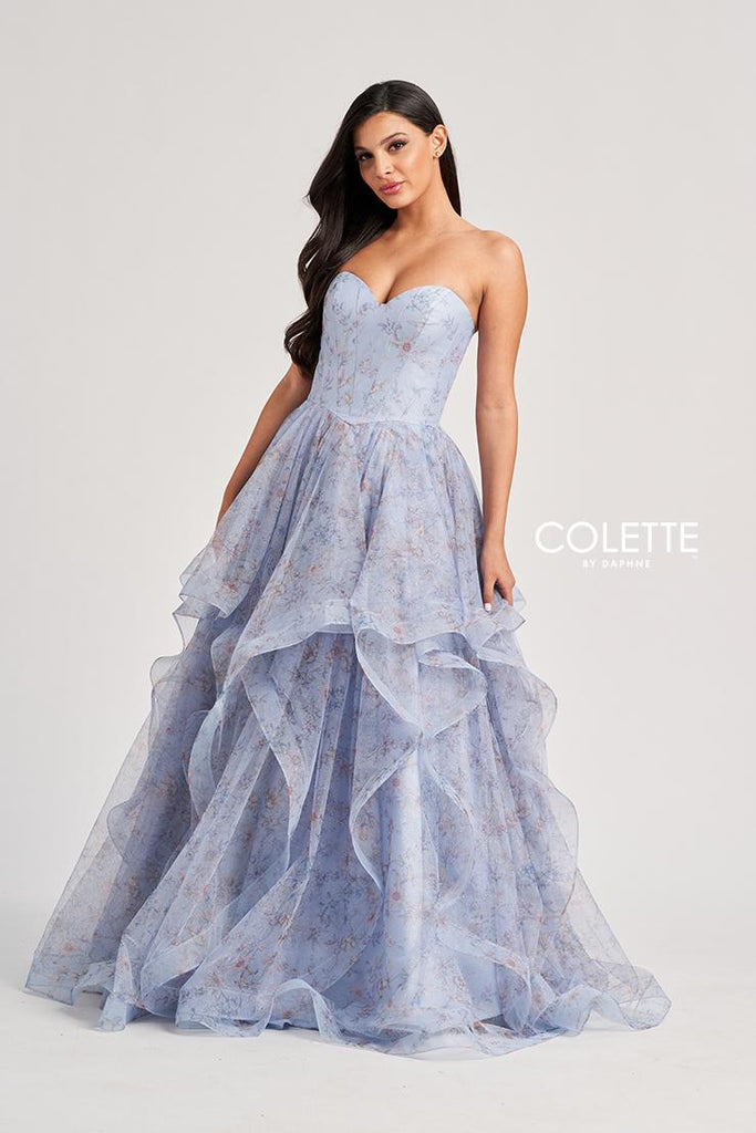 The fabric in this Colette by Daphne dress is Printed Glitter Tulle, Matte Satin Lining, Horsehair