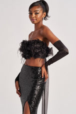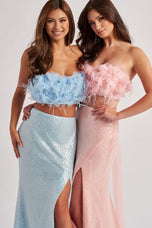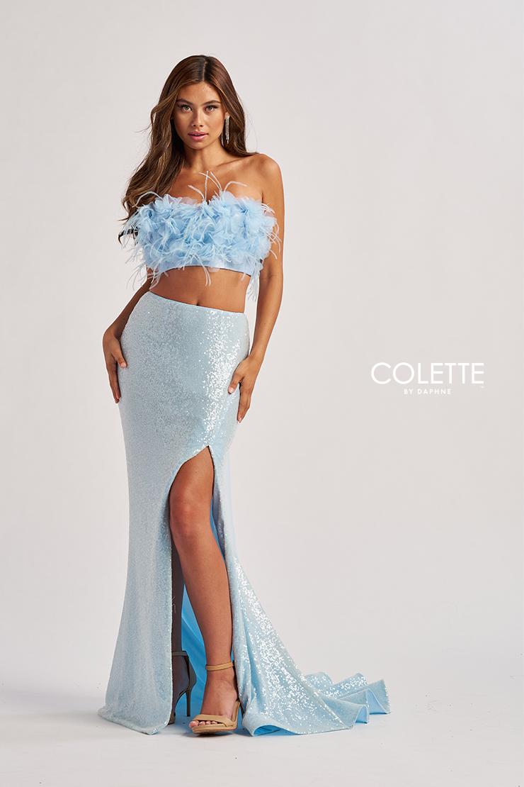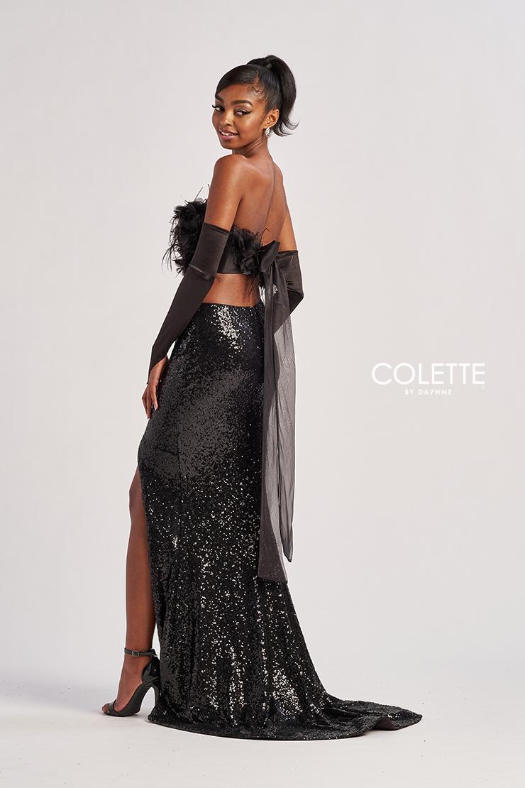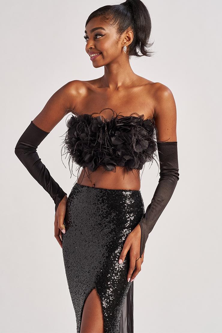 The fabric in this Colette by Daphne dress is Stretch Sequin, Three-Dimensional Flowers, Feathers, Stretch Lining