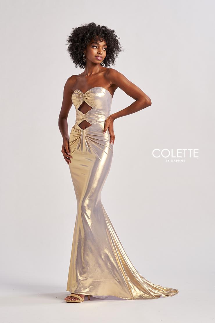 The fabric in this Colette by Daphne dress is Liquid Lame, Beads, Accent Stones, Stretch Lining