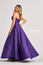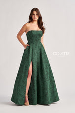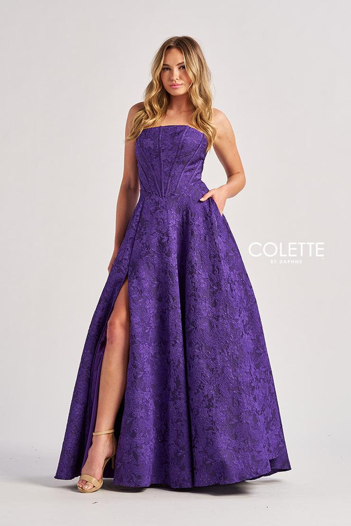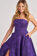 Embody sophistication with this stunning strapless brocade A-line gown, designed to captivate. Featuring a fitted corset bodice, this dress enhances your shape with elegant structure, while the luxurious brocade fabric adds a rich, textured finish. The long A-line skirt flows beautifully to the floor, with a slit that adds a modern, sultry edge to the classic silhouette. Perfect for formal events or special occasions, this gown effortlessly combines timeless beauty with contemporary allure, ensuring you make an unforgettable impression.