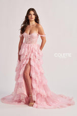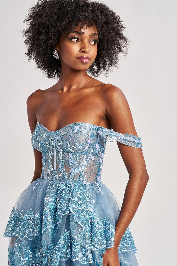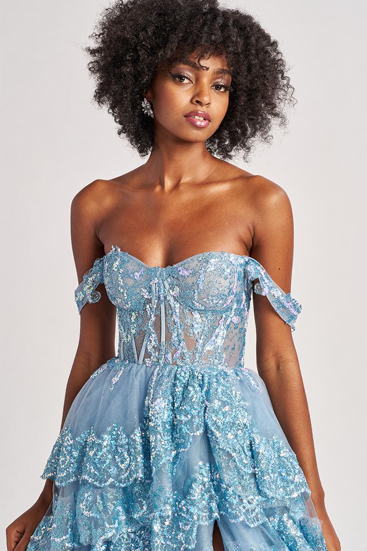 Embrace timeless elegance with this breathtaking off-the-shoulder A-line gown. Featuring a structured corset bodice with lace appliqus and accent stones, this dress sparkles with every step. The off-the-shoulder neckline gracefully frames the collarbone, while a lace-up back allows for an adjustable fit. The flowing A-line skirt is crafted from glitter tulle, adding a hint of shimmer, while a daring thigh-high slit provides a modern edge and freedom of movement. Perfect for proms, galas, or any unforgettable evening, this dress combines classic beauty with contemporary allure.
