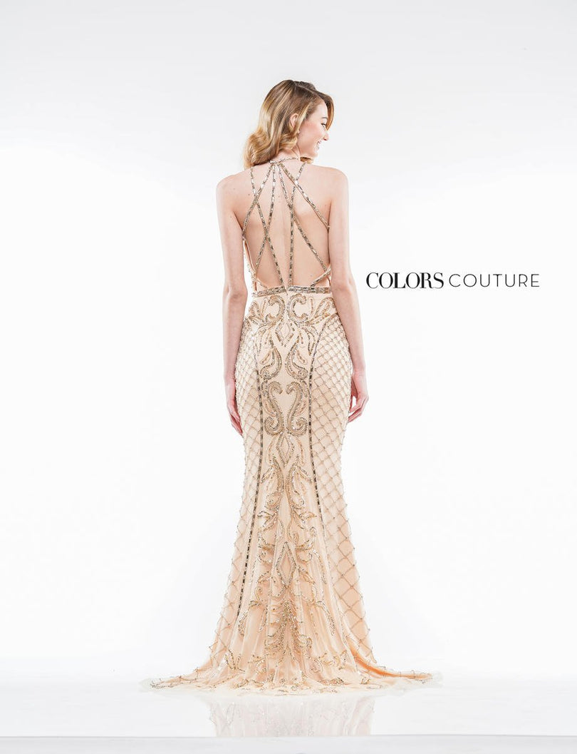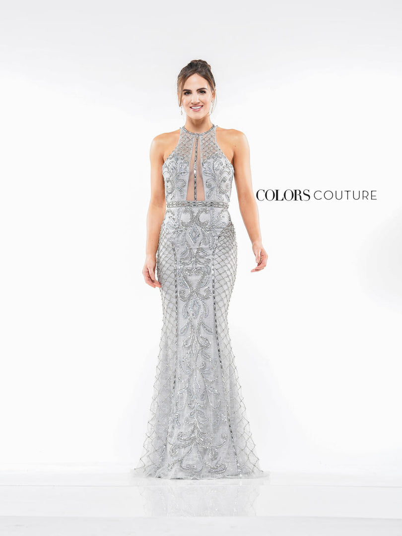 Win the crown in this long beaded dress designed by colors. Style J106 features a halter neckline with a strappy statement back that is sure to have you turning heads all night long. The sheath skirt finishes the skirt with the perfect elegant touch. This dress is perfect for prom, galas, pageants, or any other special occasion. Find your dream dress at Terry Costa!