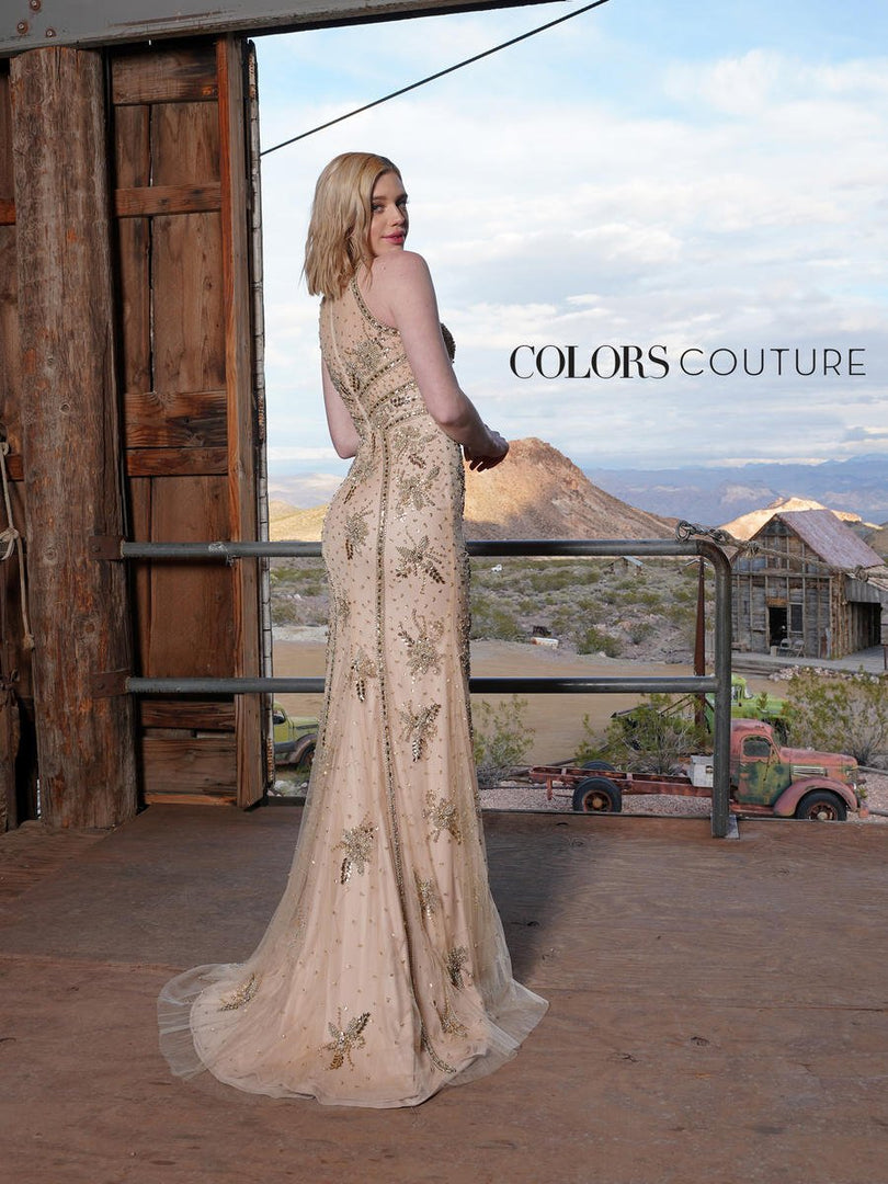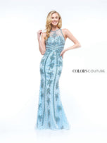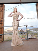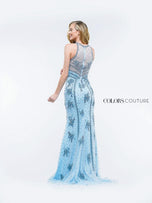 Looking for something beaded and dramatic with a modest touch? Style J112 by Colors Couture is the dress for you! This long beaded motif dress features a high halter neckline and fully covered back. The simple sheath skirt helps the intricate beading shine. This dress is perfect for prom, galas, or any other special occasion. Find your dream dress at Terry Costa!