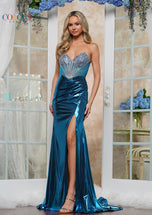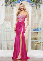 Shine bright and make your grand entrance unforgettable in this stunning Colors prom dress! The 3551 prom gown is crafted for the girl who wants all the glitz, all the glamour, and all the spotlight on prom night. Featuring a unique cat-eye neckline, this dress adds a bold, fashion-forward twist to a classic silhouette, instantly setting you apart.The sequin illusion corset top sparkles with every movement, giving you that radiant, sculpted look that feels straight off the runway. Paired with the dramatic metallic jersey fabric, this gown catches the light beautifully, creating a mesmerizing shimmer from head to toe. The thigh-high slit adds just the right amount of spice, giving this elegant design a touch of daring energy perfect for dancing, posing, and owning the night.This show-stopping Colors prom dress comes in four electrifying shadesgold, gunmetal, hot pink, and tealeach one guaranteed to turn heads and make your prom look absolutely unforgettable. Shine like never before in the 3551!