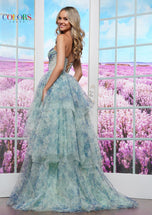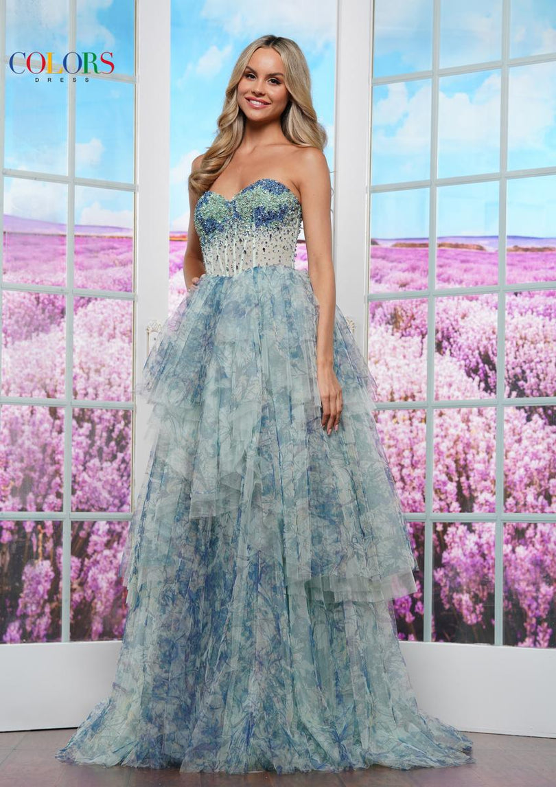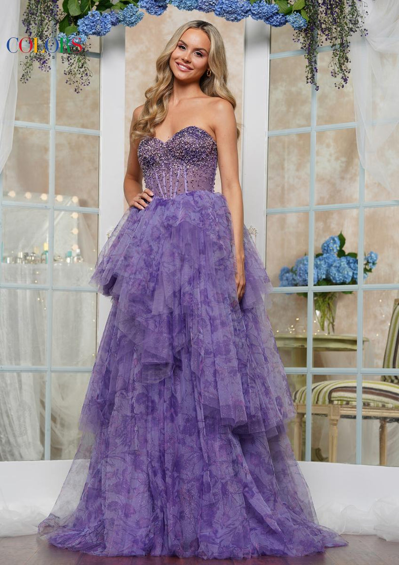 Exude pure enchantment in this gorgeous Colors prom dress. The 3572 prom dress is a dreamy blend of sparkle, romance, and runway-worthy styleperfect for anyone ready to make a magical entrance. The strapless sweetheart corset hugs your figure beautifully, featuring hot fix beading arranged in an intricate, eye-catching pattern that brings the bodice to life with shimmer and detail.Flowing effortlessly from the waist, the cascading ruffle skirt adds movement, volume, and a touch of fairytale drama. The stunning abstract floral print woven throughout the skirt gives the gown a soft, whimsical charm, making every step look like a moment straight out of a storybook.Whether youre twirling under the lights or posing for unforgettable photos, this dress guarantees a look that is both elegant and enchanting. Available in coral pink, lavender, and sage, the Colors 3572 prom dress offers three dreamy shades to perfectly match your fairytale prom moment.