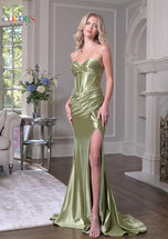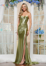 Exude timeless elegance and modern sophistication in this show-stopping Colors dress. The 3604 dress features a strapless sweetheart neckline that beautifully highlights the shoulders and dcolletage, paired with a fitted corseted bodice for a flattering, sculpted silhouette. The sleek ruched skirt flows gracefully, featuring a daring thigh-high slit that adds a touch of glamour and movement with every step. A lace-up back completes the design, combining elegance with a perfect, customizable fit.This dazzling gown comes in the versatile and stunning colors black, dark nude, mauve, red, sage, and teal, ensuring you make a statement of sophistication and style at any special occasion.