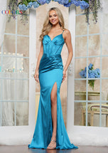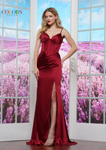 Turn heads in this stunning Colors dress 3605 prom dress, designed for a bold and unforgettable look. This fitted gown features a corset bodice with visible boning and a flattering basque waist, sculpting your figure with precision. The romantic sweetheart neckline and delicate straps add a touch of elegance, while the ruching enhances curves for a perfectly polished silhouette.The gowns daring high slit brings just the right amount of drama, while the lace-up back ensures a flawless fit and adds a modern twist to this classic style. Perfect for prom or any special occasion, the Colors 3605 lace-up dress combines glamour, confidence, and sophistication, making it a must-have for any fashion-forward celebration.