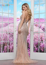 Soft sparkle meets confident drama in this fitted prom dress by Colors, designed to hug your shape in the most flattering way. The beaded mesh fabric catches the light with every step, while the plunging V-neckline and halter-style straps frame the shoulders and neckline beautifully. A lace-up back adds that adjustable, snatched-in feel, giving you both comfort and structure without sacrificing style.What really sets it apart is the detailed embellishment layered over the corset bodice, paired with a sleek silhouette and a leg-baring slit for a touch of bold energy. There is no shortage of sparkle here, but it still feels refined and intentional. The slit adds movement and confidence, making this dress feel equal parts glamorous and powerful, the kind of look that feels unforgettable the moment you put it on.
