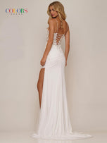 Feel absolutely elegant and stunning in this unforgettable Colors prom dress, designed to make your night truly magical. The G1086 features a romantic sweetheart neckline complemented by delicate spaghetti straps and a flattering V-neckline that beautifully frames the dcolletage. Intricate embroidered lace adds a touch of luxury and texture, while the fitted silhouette highlights your curves to perfection. A bold slit brings just the right amount of drama and movement, ensuring youll turn heads with every step. Crafted from smooth, elegant matte jersey fabric, this gown offers both comfort and style for a night of dancing and celebration. Perfect for prom or any formal evening, the G1086 is made to shine when it matters most.