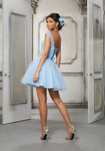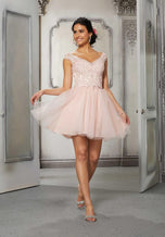 Say Yes to the Dress at Terry Costa with this gorgeous Morilee party dress. 9577, showcases a classy off-shoulder neckline with thick straps for extra support and corset lace-up back. The fitted bodice is beautifully adorned with lovely lace applique with oft sequins for sparkle. The tulle skirt will flare just right!