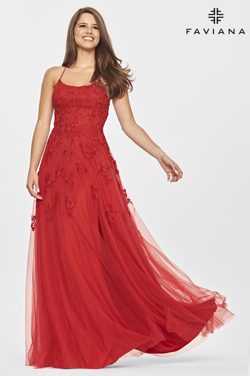 Float acrosss the dance floor having the time of your life in Faviana! Style S10823 is a gorgeous flowy A-line dress with tulle layers that add fluff to the skirt. The bodice has delicate leaf lace and sporadic stones creating a beautifully romantic look. The lace-up back is a sexy touch and helpss to create a tailored fit. Wear for your next Prom, Gala, or Formal Affair!