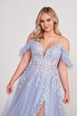 Carpe Diem! Wear the feather prom dress! What other details could you want in a long prom dress? Feathers, Lace, Tulle, Corset, Lace-up Back, Oh my! This off the shoulder beauty by Ellie Wilde checks all the boxes. Details include an off the shoulder bodice with plunging neckline, lace illusion bodice and lace-up open back. A full A-line skirt features glitter tulle with lace appliques perfectly placed throughout! Completed with a high slit and slight train.