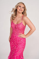 Oo la la! Ellie Wilde EW34090 is a bright and feminine mermaid prom dress with corset back and horsehair hem. The ethereal gown is embellished with embroidered leaf lace appliques and glitter tulle. The look is finished with crystal beading and stone accents. Available in 6 rich colors. The perfect gown for prom, formal, or gala!