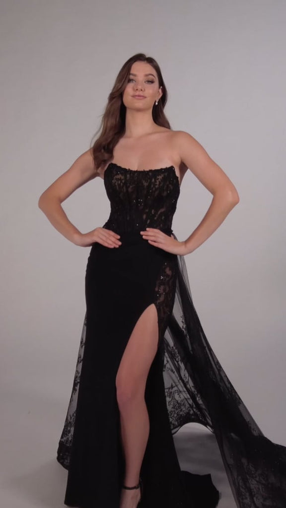 Ellie Wilde's EW35032 is a prom and evening dress designed to leave a lasting impression. The high slit adds a touch of allure and drama, allowing you to showcase your legs and make a memorable entrance. The corset bodice cinches your waist, enhancing your natural curves and exuding sophistication. One of the standout features of this gown is the detachable train, which adds an element of grandeur and transforms your look from the ceremony to the dance floor. The high slit, in combination with the lace-up grommet back, creates an alluring and modern design that is bound to capture attention. The strapless scoop neckline offers a classic touch while the fit-and-flare silhouette provides a flattering and versatile style. Whether you're attending prom or an elegant evening event, this dress promises to make you stand out and feel confident, leaving a lasting memory on your special night.