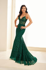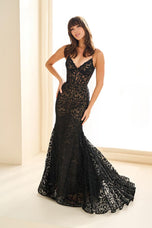An Ellie Wilde mermaid will have all eyes on you, EW36011. This gown features a sleek and sophisticated design made with venise lace that adorns the bodice and extends to the flared bottom. Crafted in luxurious and delicate tulle with stone accents that add a touch of sparkle and elegance. The dramatic cutout back adds an unexpected element.