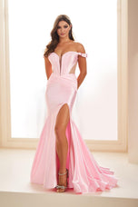 Ellie Wilde created the perfect dress for you to showcase on prom dress, style EW36024.The elegant and classic off-shoulder neckline on corset top with sheer sides. The jersey gown has a touch of shine and will hug on your figure just right! Available in 6 gorgeous colors, suitable for any and all seasons!