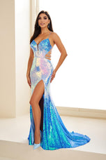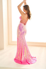 Shine and sparkle like the star you are in this stunning sleeveless gown, designed to steal the spotlight at any event. Featuring a bold plunging v-neckline, the heart-shaped bodice and bust add a flirty and feminine look that's totally unforgettable. The sequin shimmery pattern catches the light from every angle, while the ombre design gives the dress a dreamy, high-fashion vibe that feels so unique. The open-back detail, with crossed straps and a lace-up finish, serves major glam while letting you adjust the fit to perfection. A thigh-high slit adds just the right amount of edge and movement, making it super easy to strut with confidence! This gown is the ultimate blend of sparkle and radiancy!