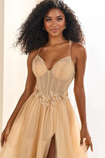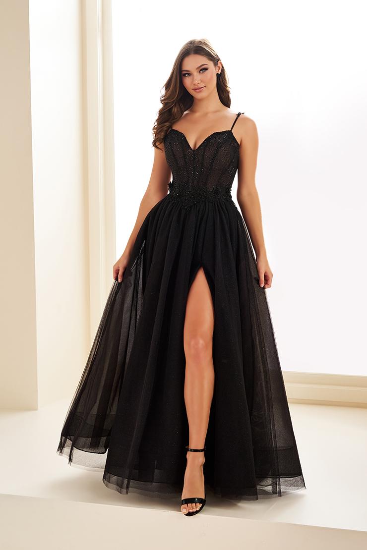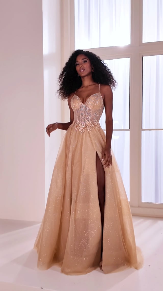 The fabric in this Ellie Wilde by Mon Cheri style is Tulle, Stone Accents, Beading, Lace Applique, Three-Dimensional Flowers, Glitter Tulle, Hard Organza, Pongee Lining, Horsehair. This style features a Corset Bodice, Slit, Side PocketsTwirl the night away in this dreamy Ellie Wilde prom dress, style EW36058. Crafted in tulle glitter fabric that will catch the light. A fitted bodice that displays a plunged neckline with dainty straps, lace detailing and three-dimensional flowers that add a whimsical touch. The full skirt is completed with a side leg slit to show off your lengthy legs! For additional details on this beauty, give us a call or chat with us now!
