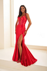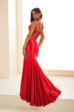 This dress is all about sleek and chic vibes! Featuring delicate, criss-cross straps in the back, It creates a stunning detail thats both modern and elegant, paired with a flirty keyhole for just the right hint of drama. The v-neckline frames the dcolletage beautifully, while the structured corset bodice ensures a snatched and sculpted silhouette. Made from smooth, curve, hugging, jersey fabric, egg slides over your figure, offering a slender fit that flutters from every angle. The material on the dress has some slight bone lining throughout it that provides structure and support, so you feel confident and secure all night long! To round off, a daring slit at a touch of sultry sophistication, perfect for showing off that leg! This gown is the ultimate glam gown!