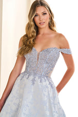 This gown is serving pure elegance with just the right amount of sparkle to make you shine. The beautifully adorned stoned off the shoulder straps bring a timeless yet glamorous vibe, making you feel like absolute royalty. The plunging illusion neckline along with the illusion sides adds that perfect mix of modern touch, while keeping it classy. Its perfect for the girls that want a little bit more of a traditional look! Designed with a flattering a-line silhouette, it flows effortlessly, giving you that dreamy, princess like movement. The soft floral print is combined with shimmering, glitter sequin embellishment along the bodice for a look thats both romantic and eye catching. Perfectly balancing classic style with a touch of glam, this gown is here to make sure you stand out in the most unforgettable way!
