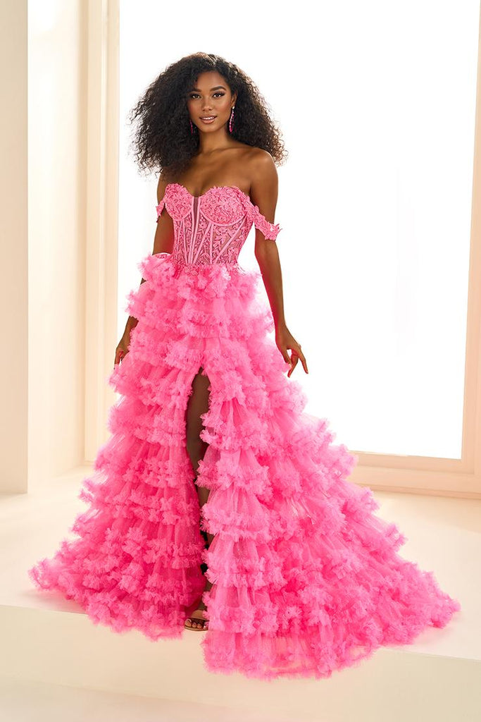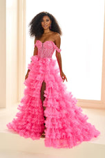 Step into a world of elegance and enchantment in this stunning Ellie Wilde by Mon Cheri ball gown, designed to make you the center of attention. The luxurious Glitter Tulle and delicate Tulle fabrics create a soft, ethereal effect that shimmers and catches the light with every move, ensuring you radiate from every angle. Intricate Appliqu detailing adds dimension and texture to the gown, while Stone Accents provide an extra touch of sparkle, enhancing the gown's opulence and glamour.The voluminous skirt, with its graceful layers of Tulle, is designed to float and move beautifully, creating a fairytale-like silhouette. The Corset Bodice is expertly tailored to define your waist and create a flattering, hourglass shape, while the Lace-Up Back provides a customizable, secure fit that moves with you. For an added touch of versatility, Separate Straps are included, allowing you to personalize the look to suit your style and preferences.A daring side slit adds a bold, sophisticated edge to the gown, offering just the right amount of allure while maintaining its timeless elegance. Whether youre attending prom, a gala, or a special celebration, this Ellie Wilde gown combines classic beauty with modern, edgy details that will ensure all eyes are on you.
