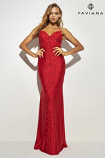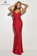 Feel fierce in this sexy and hot evening gown designed by Faviana, style 11021. New from Spring 2024, this gorgeous gown showcases a unique gathering on the fitted bodice adorned with stunning lace detail that cascades onto the fitted skirt. An eye-catching lace-up back for a snug fitting completes this look!