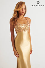 Embrace elegance in this E11201 Faviana satin scoop neck dress adorned with stunning sequin appliqu. Includes an empire bust line and a twist at the back zip. The delicate embellishments add a touch of sparkle, making this dress perfect for any special occasion or evening out!