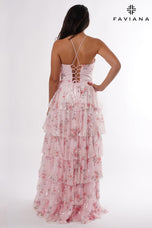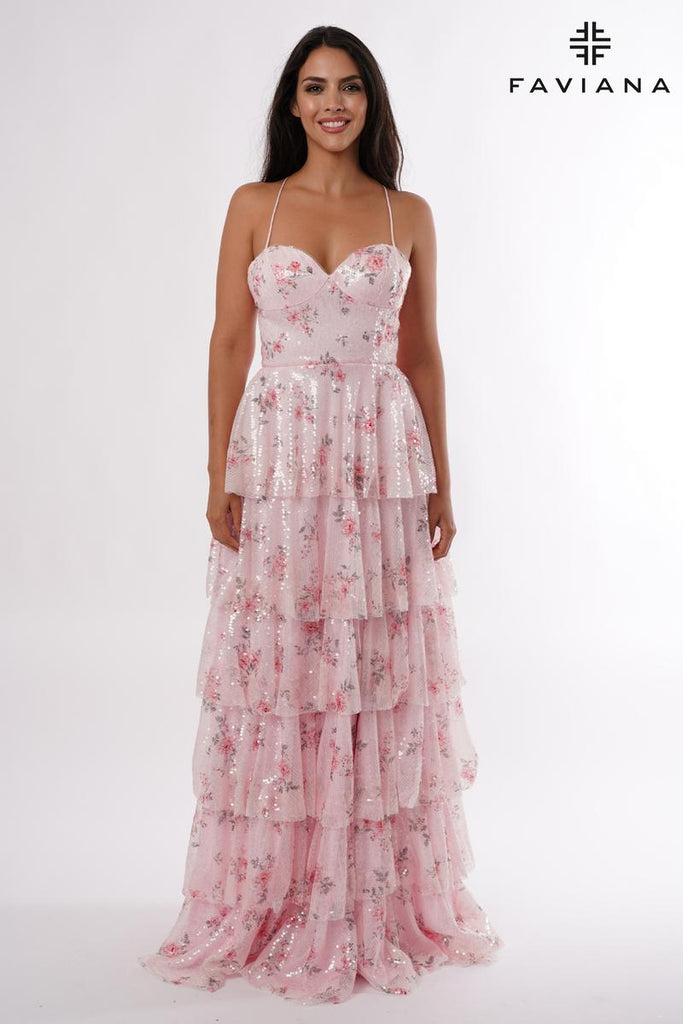 Are you in your cottage-core era? You have to try this NEW Faviana made in a beautiful vintage Floral Sequin fabric. Featuring a sweetheart neckline, Tiered ruffles and a lace up back, this frilly dress is perfect for frolicking in a flower meadow, and of course, your big night out.