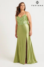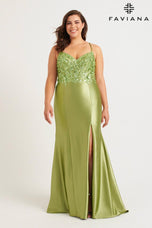 Uff..this gown is just *chefs kiss* From the beautiful color to the immaculate beadwork on the bodice. 9563, is a Faviana creation from Spring 2025, that displays a soft v neckline with thick straps that leads to the open lace-up back for a snug fit, a corset top that will accentuate your waist and adorned with sparkly beading and lace details. The skirt is completed with a thigh-high leg slit and soft train. Showcase this beauty to any social gathering!