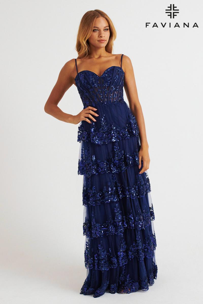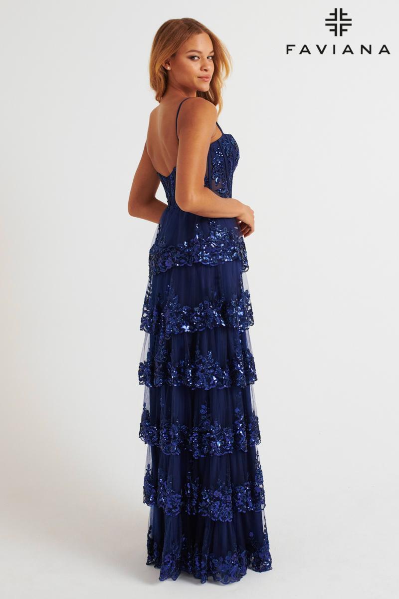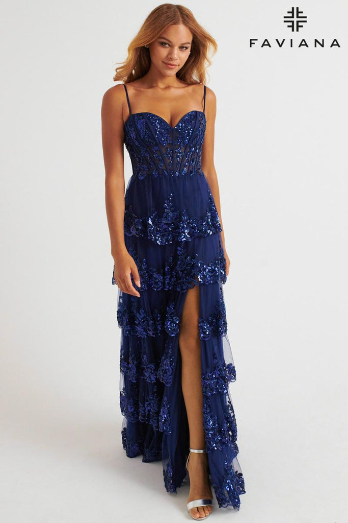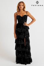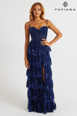 This dress is the perfect combination of elegance and fun. The scalloped tiered skirt provides the perfect touch of flare creating subtle dimension while maintaining a sleek, column-like silhouette. Featuring an applique corset bodice with spaghetti straps and an invisible zipper. Perfect for a modern, refined style!