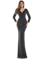 Have all eyes on you in this mesmerizing Colors evening gown, G1042SL. Embellished with streams of sparkling sequins, this long fitted evening showcases a sexy deep v-neckline with long sparkling sleeves. Completed with a sweep train that will sway with every step that you take! Perfect attire for Senior Prom, Black-tie or gala!