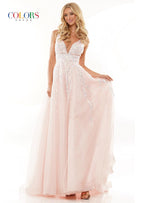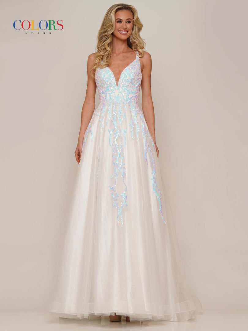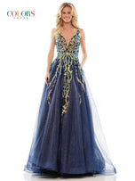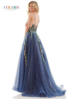 Glow by Colors Dress G1103 is a glitter tulle A-line prom dress with a plunging v-neckline, lace-up back, and a horsehair hem. The entire gown is embellished with sparkle, with a baroque-inspired sequin pattern concentrated on the bodice and cascading down the skirt into glitter tulle. Look out of this world at prom 2023 in this incredible gown by Glow Dress.