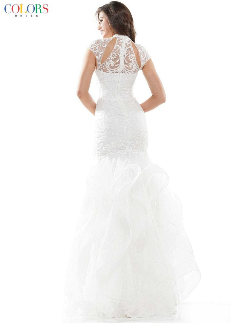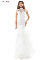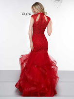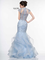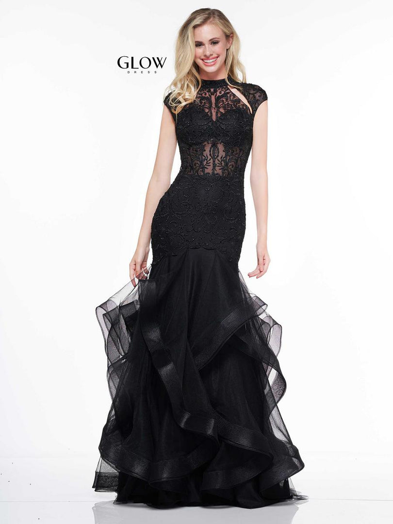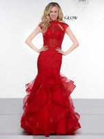 Embrace your uniqueness in this gorgeous mermaid gown designed from Glow by Color. G842, is fully made in mesh and lace fabric! It showcases a high sheer laced illusion neckline with front and back cutouts and caps sleeves. An enclosed zipper back with cutouts. A fitted silhouette that will hug your figure beautifully. The gown is completed with a full ruffled layered skirt finished off with horsehair hem! Making it the perfect gown for any Social Occasion!