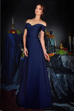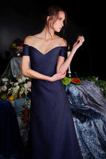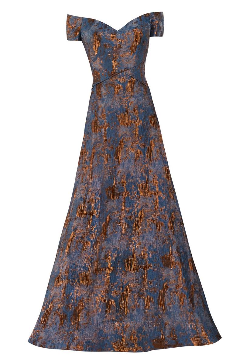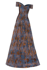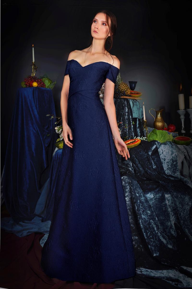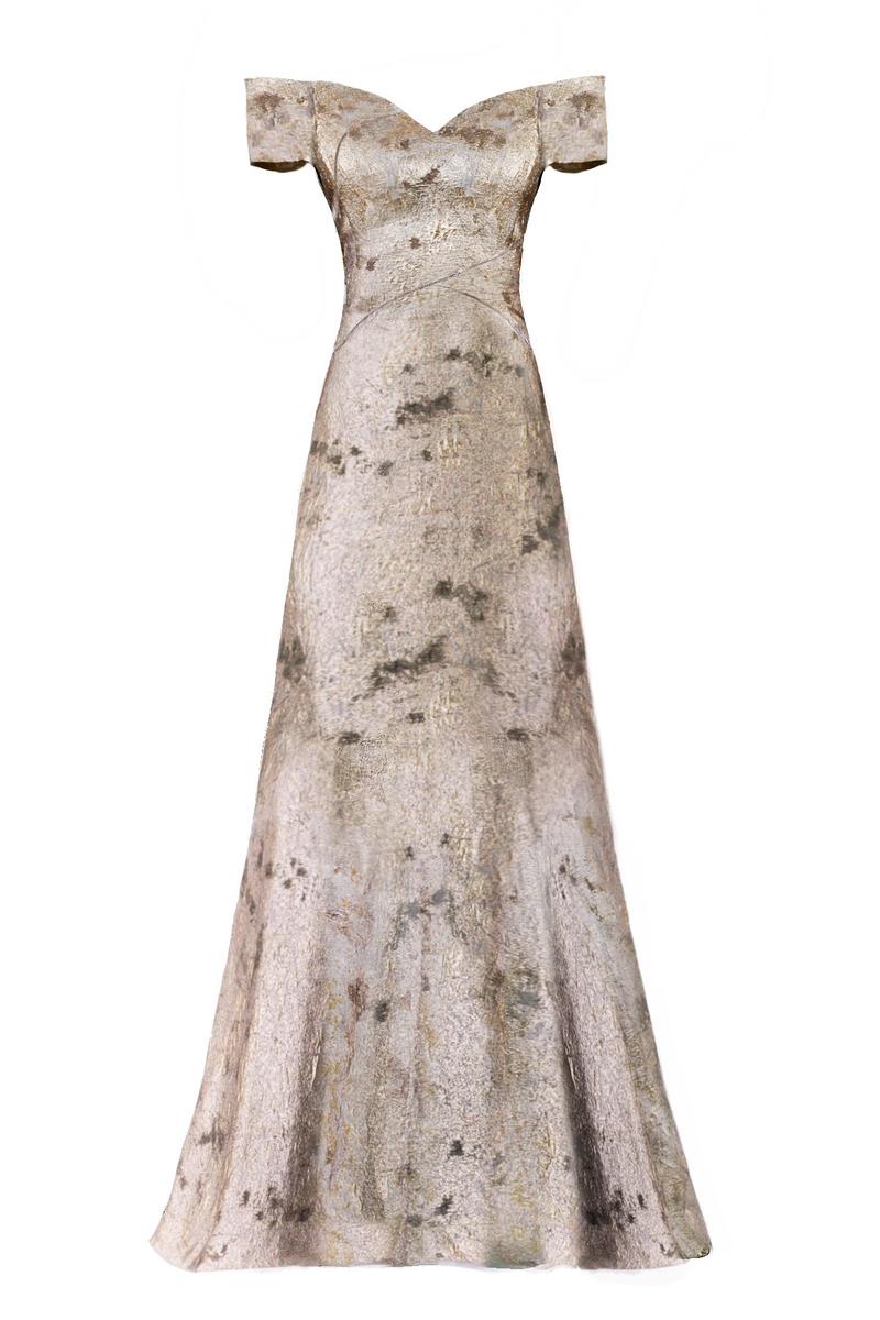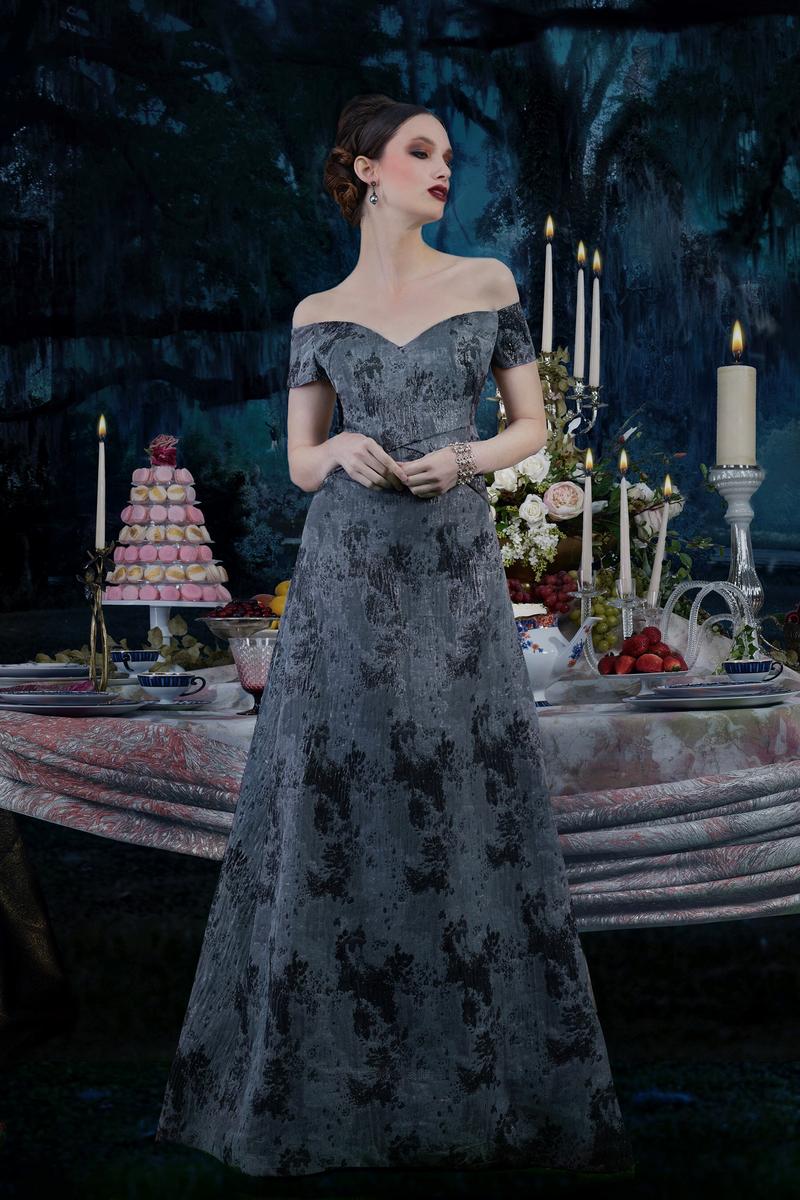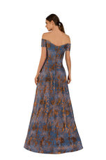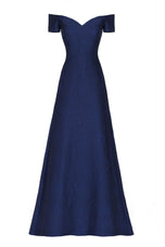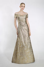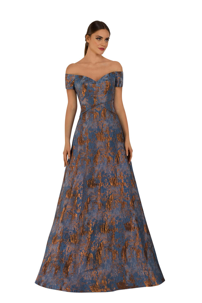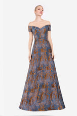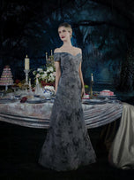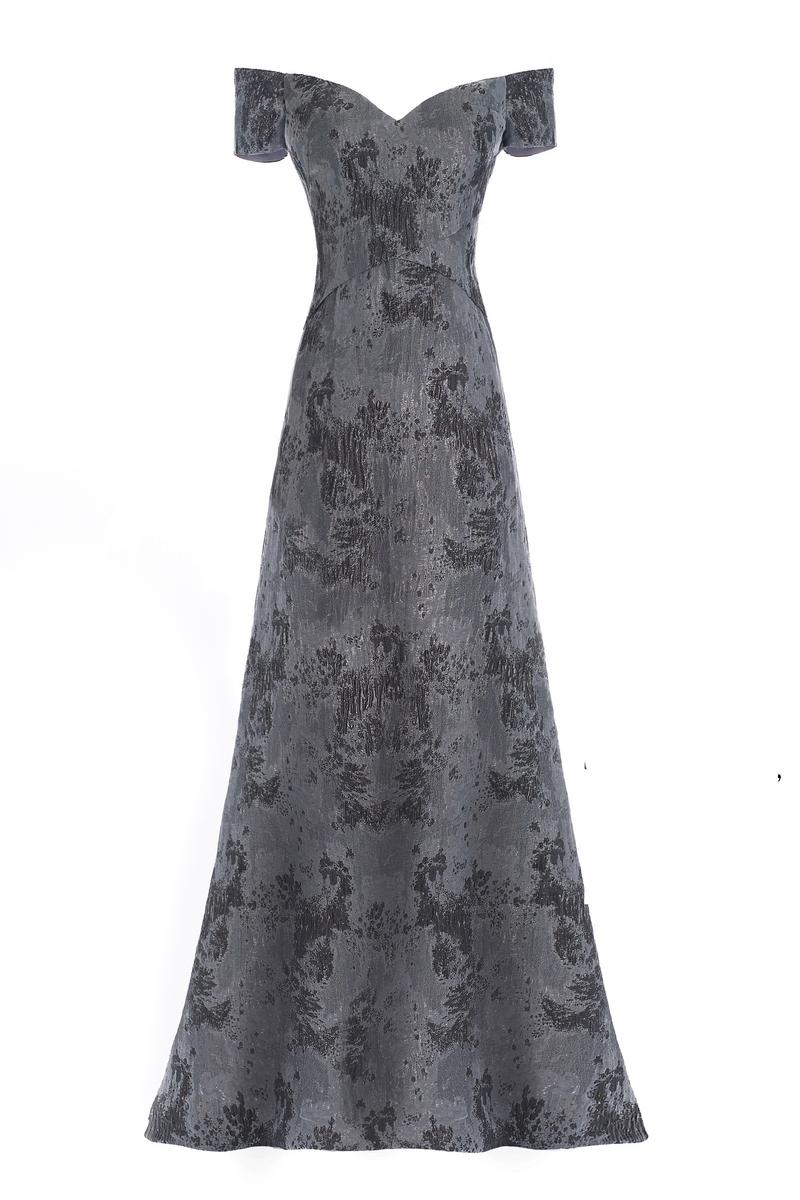 This unique jacquard a-line gown brings the queen out of every woman. The classic a-line dress gets a modern take through the off-the-shoulder bodice and rich jacquard. This dress is a perfect for every woman and every occasion.