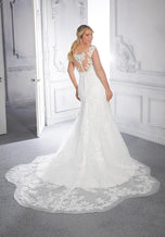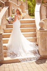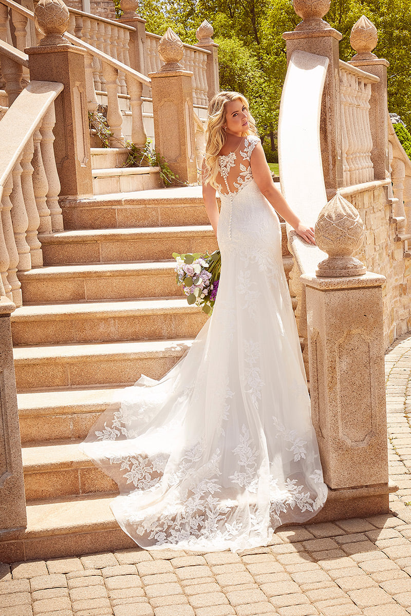 Cathy is the total plus-size package with her sultry fit and flare silhouette and gorgeous frosted, embroidered appliqus. Created for the curvy Julietta by Morilee collection in Fall 2021, you'll find this to be a flattering fit whether you're apple-shaped, pear-shaped, hourglass or anything in between. The sheer, off-the-shoulder neckline gives way to a beautiful illusion back, lined with dainty covered buttons. An ethereal, sheer petal train completes this darling dress, just right for your destination wedding or romantic outdoor ceremony. Available in three lengths for our petite and tall brides. Please call our Dallas, Texas location to check in-store availability, pricing and current ship dates.